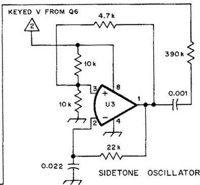 U3 è un oscillatore di tonalità laterale (sidetone). Il livello di iniezione è regolato dal resistore da 100 Ohm al pin 6 di U2B. Il livello può essere variato per adattarsi al gusto individuale cambiando il valore del resistore.