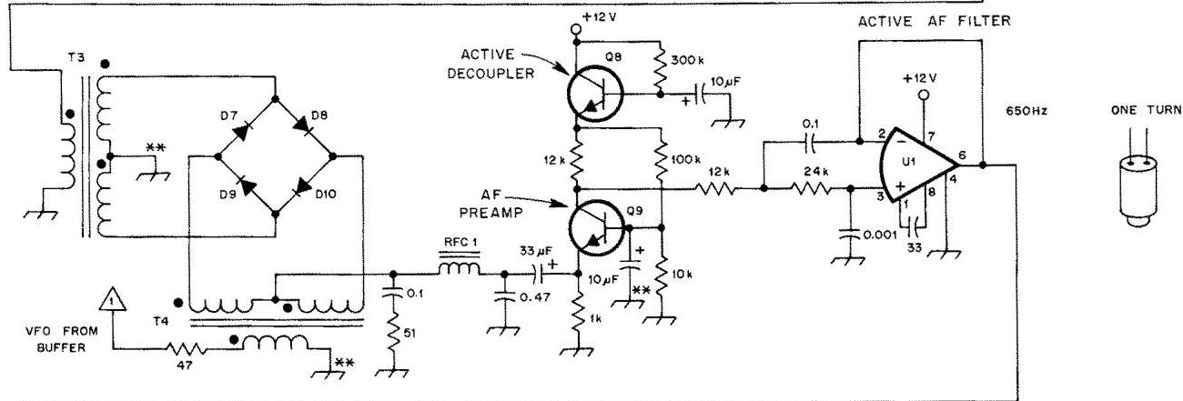 Un filtro audio attivo segue il preamplificatore AF. Il filtro ha una risposta passa-basso piccata con un Q di cinque—abbastanza basso da mantenere il ringing impercettibile. È semplice, non critico e adeguato per l’operatività generale. La frequenza di picco è di circa 650 Hz, che corrisponde allo spostamento di frequenza trasmissione-ricezione con il controllo RIT centrato. Un op amp LM301 è stato usato per il suo basso rumore e assorbimento di corrente relativamente basso. Un TL071 o TL072 dovrebbe dare prestazioni comparabili, e una sezione di un LM358 può essere usata con un aumento di 2 dB della figura di rumore.