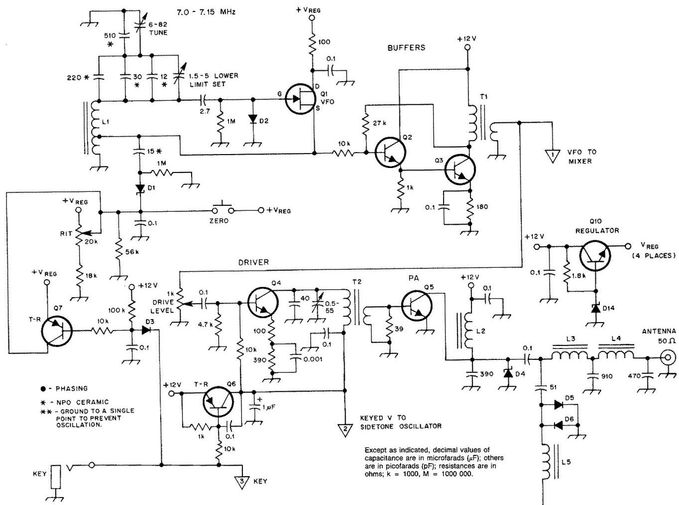 Lo spostamento di frequenza dell’oscillatore è ottenuto cambiando la polarizzazione sul diodo Zener (usato come condensatore a tensione variabile) nel circuito VFO. Q7 fornisce il timing; si accende rapidamente quando la chiave è chiusa, ma si spegne circa 5 ms dopo che l’uscita del trasmettitore scende a zero dopo il rilascio della chiave. L’inserimento modellato è fornito da Q6 e i componenti associati. È richiesta la commutazione simultanea di base e collettore dello stadio pilota per dare i tempi di salita e discesa desiderati (qualche ms) all’uscita del trasmettitore. L’oscillatore di tonalità laterale è innescato dalla stessa linea.