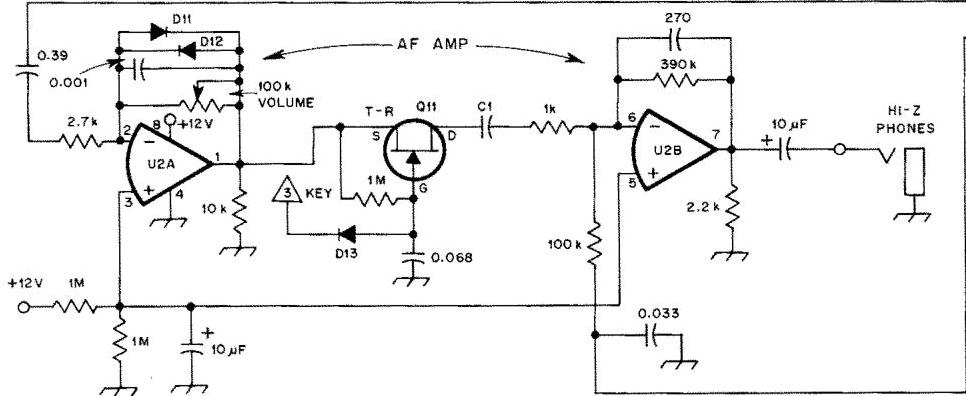 I costruttori potrebbero voler aggiungere un’uscita audio a bassa impedenza. Questo può essere fatto riducendo il guadagno di U2B (cambia il condensatore da 270 pF a 0.0056 F e il resistore da 390 Ohm a 20 Ohm e instradando l’uscita di U2B a un circuito amplificatore LM386.